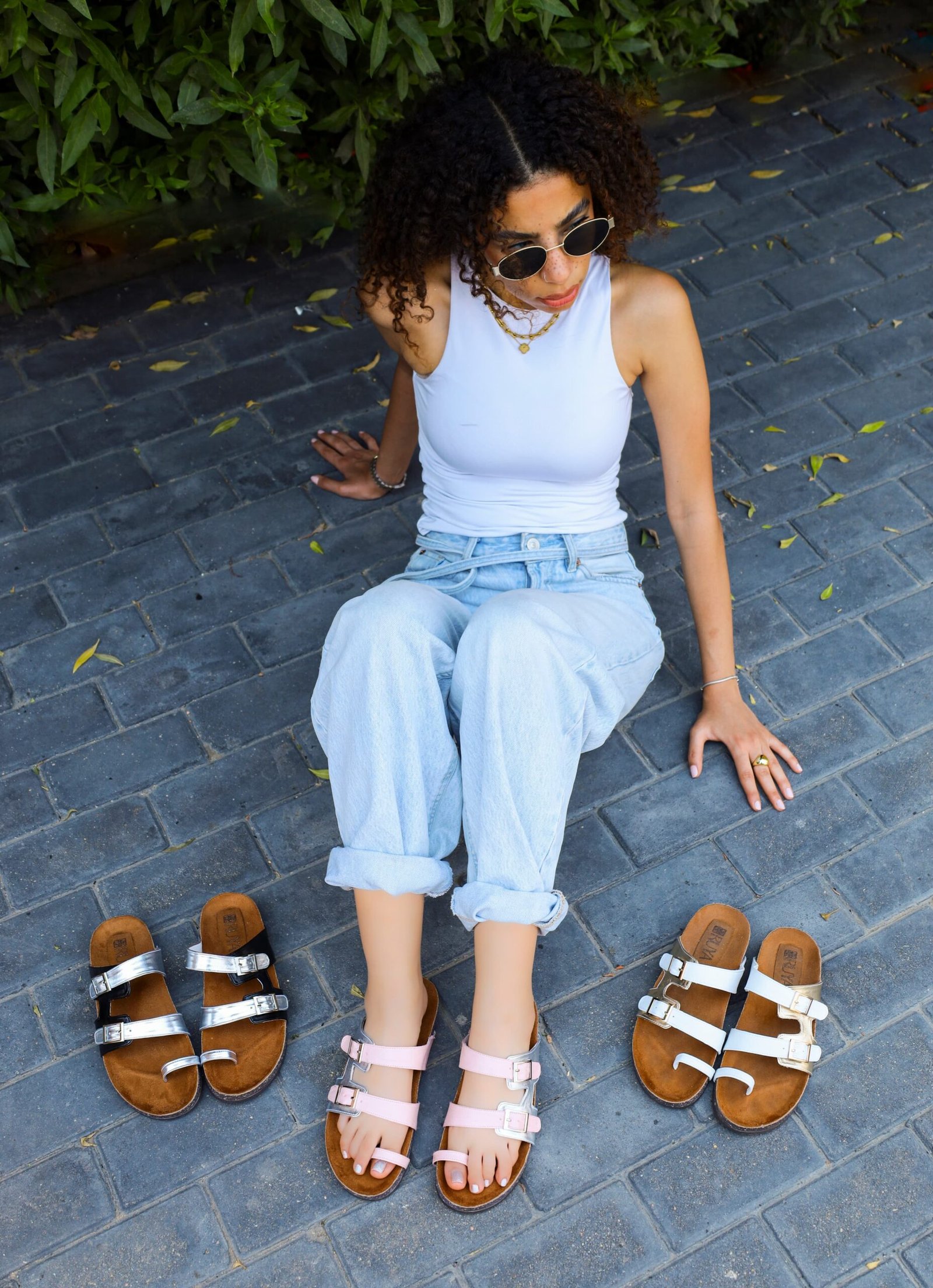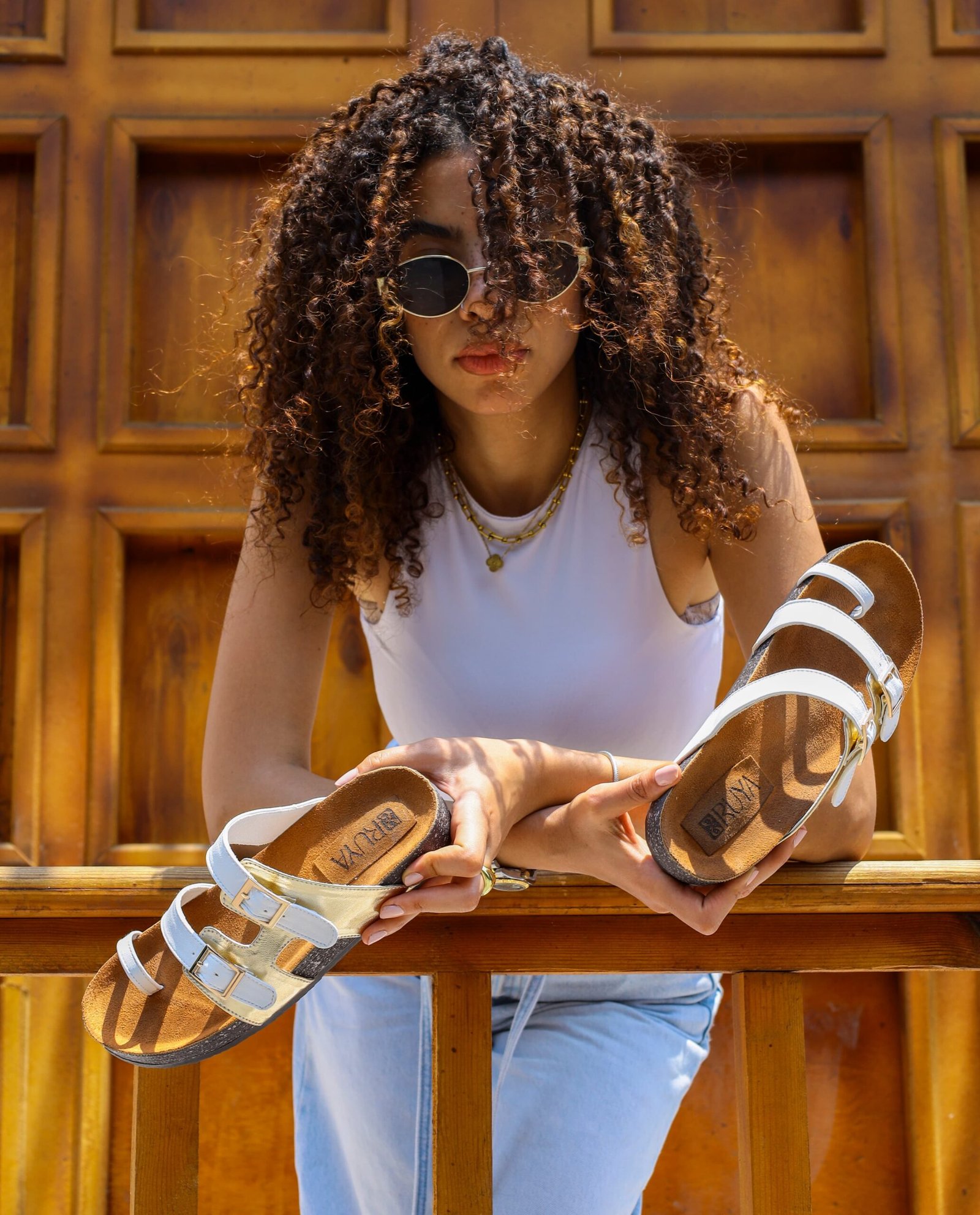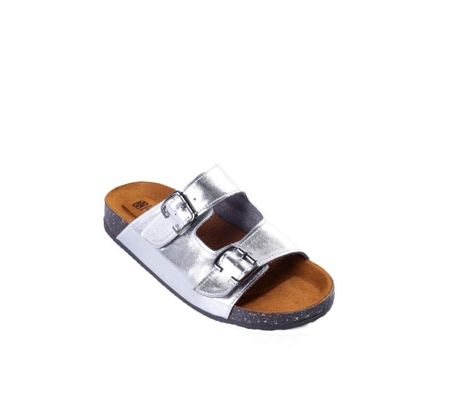 “Glossy leather slipper with two buckles, suede lining (inside and outside), flexible orthopedic sole, and treated accessory.”
