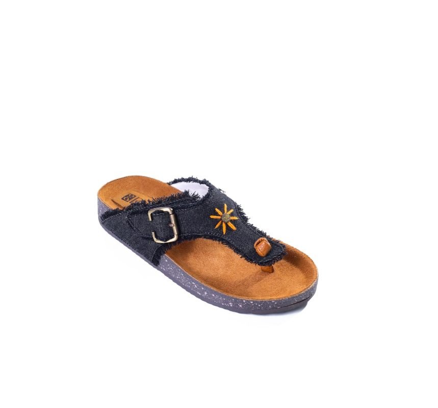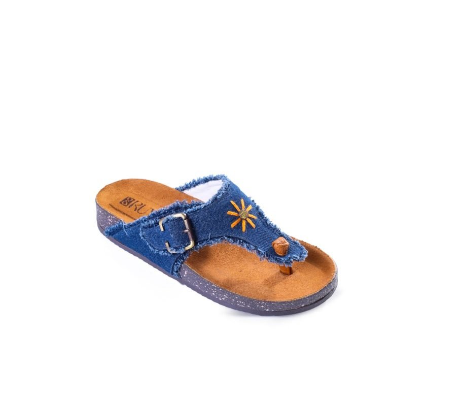 “Pure denim slipper with toe design, handmade, flexible orthopedic sole, and treated accessory.”