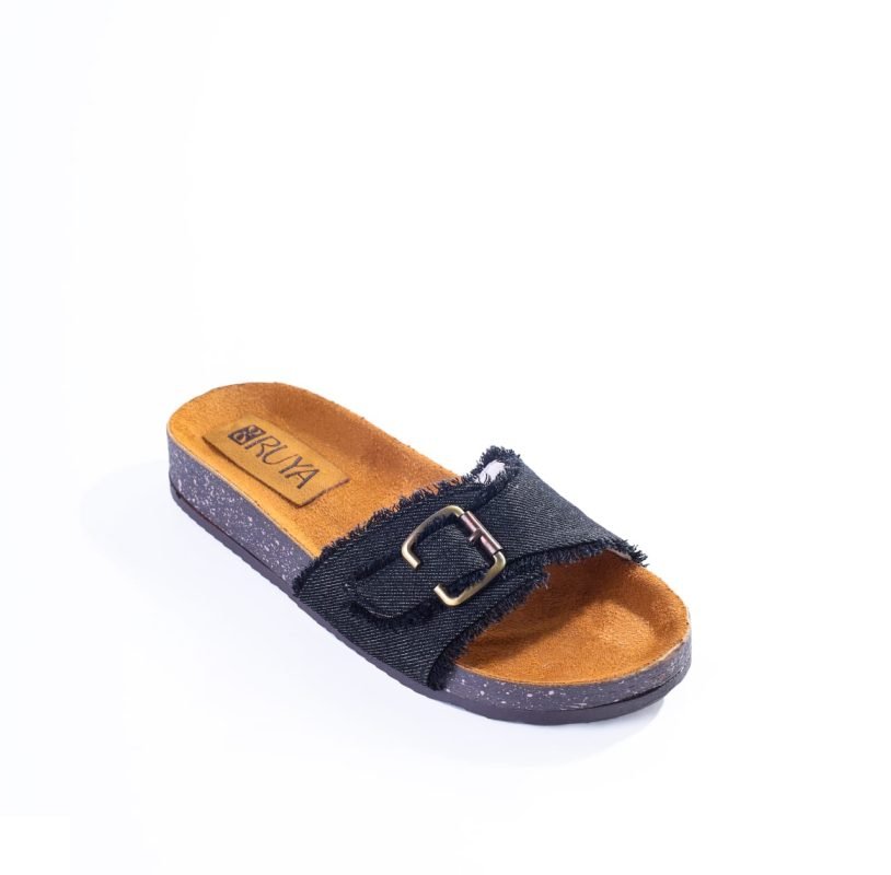 “Denim buckle slipper with open design, handmade, cushioned orthopedic sole, and durable accessory”