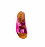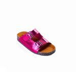 Shiny leather toe slipper with two buckles, flexible orthopedic sole, and treated accessory.