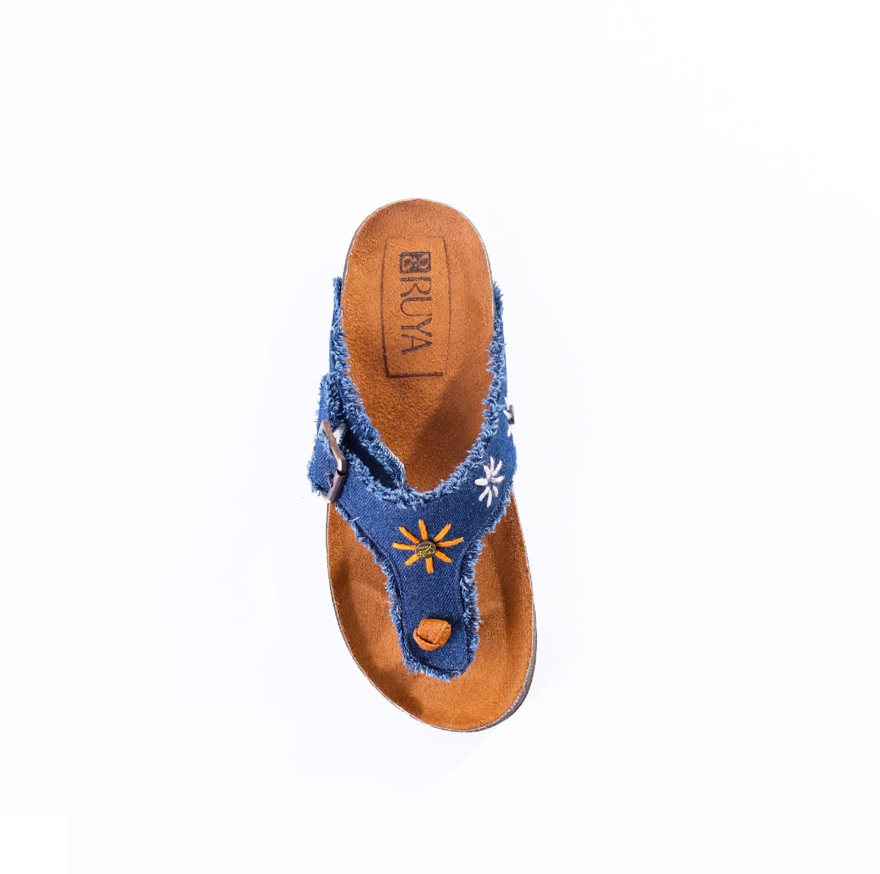 "Pure denim slipper with toe design, handmade, flexible orthopedic sole, and treated accessory."