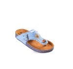"Pure denim slipper with toe design, handmade, flexible orthopedic sole, and treated accessory."