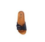 "Denim buckle slipper with open design, handmade, cushioned orthopedic sole, and durable accessory"